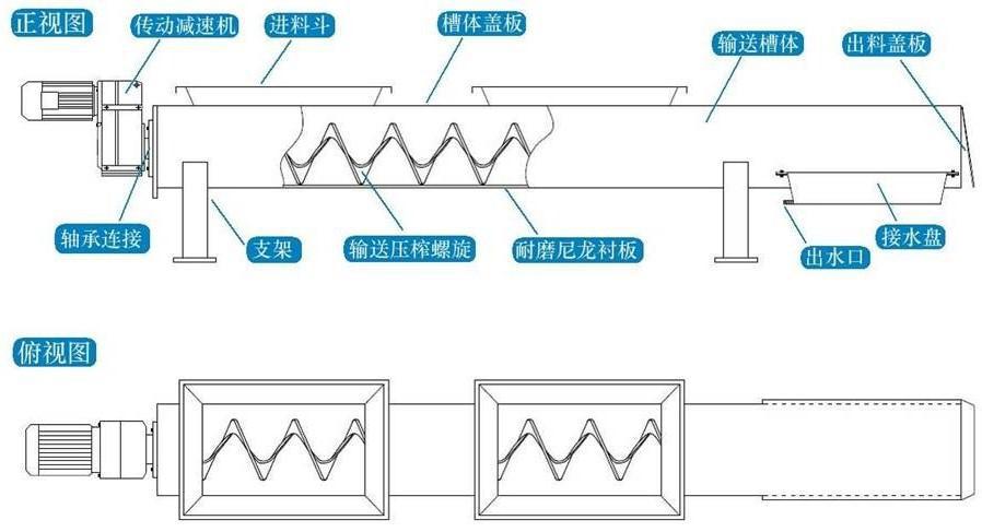 該壓榨機輸送壓榨殼體采用U型槽式結構,上部封蓋板,為增加出料高度,一般為平送出料。 壓榨螺旋采用無軸螺旋,下襯耐磨尼龍襯板,增加了輸送長度,壓榨部分為平送壓榨結構。 可同時接受多臺格柵出料,輸送加壓榨一體,減少了動力消耗及設備投資。