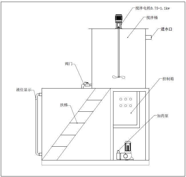 2、存藥箱:用于存放已經(jīng)攪拌好的溶液,供投加設(shè)備用。