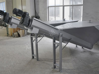 砂水分離器設備一般螺旋傾角為25~30°之間,砂水混合液從進水管進入本設備,混合液通過分離機上部的聚集箱,在水流的作用下,使混合液的砂粒與有機物進行分離,砂水進入集砂槽中,比重較大的顆粒(如砂粒)由于自重而下降,沉積于螺旋槽底部,在螺旋葉片的推動下,物料沿斜置的U型槽底部提升,離開液面后,繼續(xù)上移一段距離,砂粒中的水分逐漸在螺旋槽葉片的空隙中流回水箱,砂粒液逐漸干化到出料口處,依靠自重落入其他輸送裝置中,上清液則不斷從排水堰溢流出去,有機物在水流漩渦的作用下,也跟著上清液從溢流槽流出,回流至污水井中,從而達到砂水分離的作用。