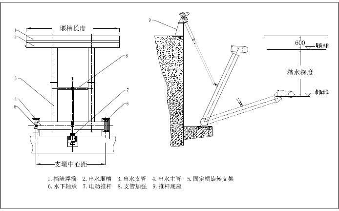 XB旋轉(zhuǎn)式潷水器主要由電控箱、電動推桿、潷水主管及支管、堰槽組件、浮筒組件、出水組件、行程控制、底座等部分組成。旋轉(zhuǎn)式潷水器由電動推桿把水下部分與執(zhí)行機(jī)構(gòu)連接起來,當(dāng)需要排水時,中央控制系統(tǒng)會給出信號,指令電機(jī)驅(qū)動螺桿旋轉(zhuǎn),電動推桿向前推出,集水堰槽隨水平管的轉(zhuǎn)動而下降,開始潷水,排出的上清液由排水管排出,當(dāng)潷水結(jié)束后,推桿內(nèi)計(jì)數(shù)器給出信號,電機(jī)反轉(zhuǎn),牽引集水堰槽上移,回到預(yù)置位置,等待完成下一個循環(huán)。