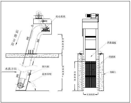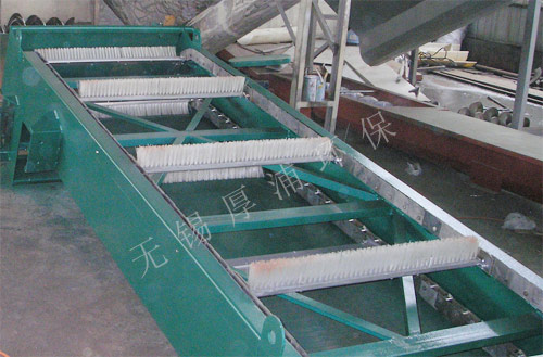 WBF轉(zhuǎn)刷網(wǎng)蓖式格柵除污機(jī)主要由驅(qū)動(dòng)裝置、機(jī)架、主軸、柵網(wǎng)、托渣板、固定板刷、回轉(zhuǎn)刷及牽引鏈組成。在電機(jī)驅(qū)動(dòng)下,通過(guò)減速機(jī)減速后,帶動(dòng)鏈輪與鏈條運(yùn)動(dòng),固定在回轉(zhuǎn)鏈條上板刷沿柵網(wǎng)網(wǎng)面由下而上移動(dòng),清掃網(wǎng)面并帶走污物,污物運(yùn)送至頂部時(shí),大部分靠重力自行落至排渣都,少量附著在固定板刷上的污物被轉(zhuǎn)動(dòng)的回轉(zhuǎn)刷清除掉,完成除污過(guò)程,液體則通過(guò)柵網(wǎng)的間隙流過(guò),整個(gè)工作過(guò)程連續(xù)進(jìn)行。